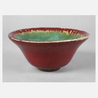 Ende 19. Jh., am Boden undeutliche Marke, Feinsteinzeug in kräftiger ochsenblutfarbener bzw. jadegrüner Glasur, tief gemuldete Schale über schmalem Stand mit weit ausschwingender, stark konisch zulaufender Wandung, Altersspuren, Craquelé, D 17 cm.
