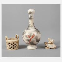 Anfang 20. Jh., mehrteilig gefertigt und montiert, dabei Miniaturvase, signiert, fein graviert und farbig gefasst, kugeliger Korpus verziert von Vogelmotiv, dazu Okimono mit zwei Schildkröten auf Weidenkorb, Erhaltungsmängel, H 6,5 und 12 cm. BITTE BEACHTEN: VERSAND ERFOLGT NUR INNERHALB DER EU - SHIPPING TO THE EU MEMBER COUNTRIES ONLY.