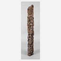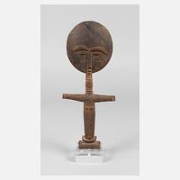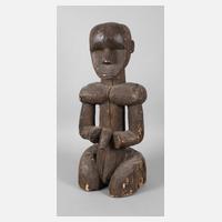 Zentralafrika/Kongobecken, der Volksgruppe der Luba/Hemba zugeordnet, dunkelbraunes hartes Tropenholz, figürliche Darstellung eines Mannes, dienen zur Erinnerung an den Verstorbenen und bleiben eigentlich auf der Grabstätte, bis das Holz verwittert, wird meist für Angehörige der Herrscher verwendet, Spannungsrisse, stärkerer, inaktiver Anobienbefall, sonst gute Erhaltung, H 73 cm.
