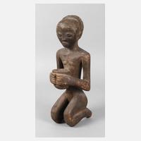 vom Stammesschnitzer eines Luba in Zentralafrika, Ahnenfigur eines jung verstorbenen Kindes, um Gaben im Jenseits bittend, weiches, gebräuntes Tropenholz, geringe, unbedeutende Wurmschäden, 2. Hälfte 20. Jh., H ca. 42 cm.