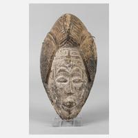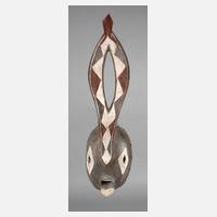 20. Jh., dem Stamm der Bwa zugeordnet, stilisierte bogenförmige Maske aus dem leichten Holz des Baumwollbaums, auch Plankenmaske genannt, weiße und rote Staffierung auf grauem Grund, mit stark gemuldetem Aufsatz mit spitzovaler Aussparung, kleinere Ausbrüche, zum Tragen ringsum gelocht, H ca. 70 cm.