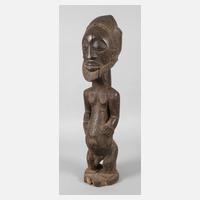 Mali, wohl 1. Hälfte 20. Jh., der Volksgruppe der Bambara zugeordnet, hartes Tropenholz, vollplastische Darstellung einer Frau mit Tatauierungen an Kopf und Körper, mit Resten alter Farbfassung, jetzt meist stark verputzt, leichte Krustierung, Trocknungsrisse, H 57 cm.