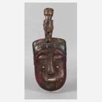 Westafrika, der Volksgruppe der Senufo zugeordnet, wohl für Initiationszeremonien, weiches braunes Tropenholz, beschnitzt und teils farbig gefasst, ovale, leicht gewölbte Augen mit geschlossenen Lidern, zwei Löcher zum Sehen in den Wangen, mit figürlichem Aufsatz in Form eines Mannes, berieben, rote bzw. schwarze Krustierung, kleinere Schäden, H 41 cm.