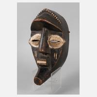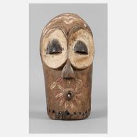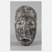 Zentralafrika, der Volksgruppe der Songye zugeschrieben, Holz beschnitzt, teils weiß und schwarz gefasst, Maske eines Geheimbundes, mit rund gewölbten Augen, hervorstehendem Mund mit Querkerbe, langem Kinn, tiefen und glatten Wangen, mit Resten alten Anobienbefalls, berieben, sonst guter Allgemeinzustand, H ca. 33 cm.
