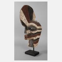Kongobecken, der Volksgruppe der Songye zugeordnet, wurde vom Geheimbund der Bwadi Bwa genutzt, weiches Tropenholz schwarz, weiß und rot gefasst, mit maskulinem Haarkamm, rund nach vorn gewölbten Augen, diese mit Sehschlitzen, vorstehendem Mund, mit Aufsteller, leichte Abnutzungsspuren, H ges. ca. 56 cm.