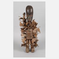 Kongogebiet, 20. Jh., der Volksgruppe der Yombe aus dem Chilango-Tal zugeordnet, stehende Figur aus braunem, schwerem Hartholz, außer am schwarz gefärbten Kopf vollflächig mit Nägeln und Blechen verziert, Augen rot gefasst, im Bauch mit verglastem Fach für Reliquien, H 60 cm.