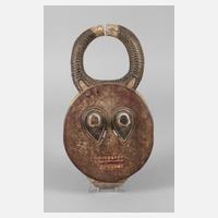 Burkina Faso, der Volksgruppe der Bobo aus der Region Koundougou zugeordnet, Holz beschnitzt und farbig gefasst, als runde Scheibe gestaltet, mit Sehschlitzen neben den kreisrunden Stielaugen, darüber gebogene Hörner, gemuldetes Trageteil mit zwei Halterungslöchern, Farben stärker berieben, seltenes gebrauchtes Stück, H ges. 32 cm.
