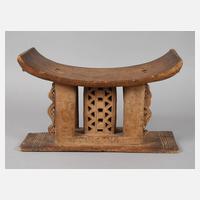 Ghana, der Volksgruppe der Aschanti zugeordnet, helles hartes Tropenholz, beschnitzt, aufwendig gearbeitet mit durchbrochen gearbeiteter Mittelsäule und vier ovalen beschnitzten Säulen, gemuldete Sitzfläche, traditioneller Klanhocker der Akan, wahrscheinlich nur rituelle Bedeutung, leichte Ausbrüche, Maße 28 x 43 x 20 cm.