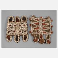 wohl Kongo, aus mit Zierbändern und Kaurischnecken verzierten Peddigrohrstreifen hergestellt, im Fischgrätenmuster gearbeitet, feine Stammeskunst, neuere Arbeit, Maße je ca. 23 x 16 cm.