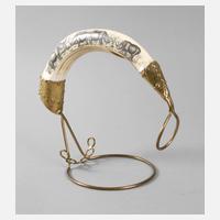 Südafrika, signiert Strggle Boniba, aus einem Flusspferdhauer gefertigt, verziert mit Darstellung einer afrikanischen Savanne mit Nashörnern und Kaffernbüffel in feinster Niellotechnik, mit Montierungen aus Messing, Z 1, L Zahn ca. 35 cm.