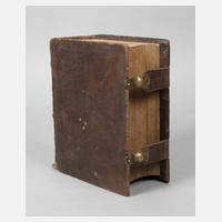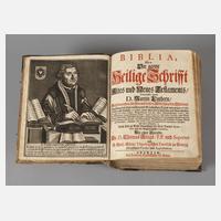 Leipzig im Verlag Sebastian Heinrich Barnbeck, Altes [Titelseite fehlt] und Neues Testament, vorgeschaltet "Kurzer Unterricht von der Biblischen Zeitrechnung, Erdbeschreibung, Münzen, Gewichten, Maaßen, Opfern, Priestern, Festen, und andern Alterthümern, deren in der heiligen Schrift gedacht wird", Format Gr. 8°, 1112 und 308 S., Ledereinband, Buchschließen intakt, altersgemäßer Zustand.