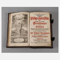 das ist: Erbauliche und Gottselige Betrachtungen über die Evangelien [...] nebst eilf Paßions-Betrachtungen [...] wie auch einer Kirchweih- und Christnachts-Erbauung, im Vertrauen auf Güte dem Druck überlassen von Gottfried Kleiner, 15. Ausgabe, Hirschberg bey Krahns Wittwe 1792, Format Gr. 4°, 7 Blatt und 670 S., Kupferstichfrontispiz, Vor- und Nachsatz mit handschriftlichen Notizen zu Geburten von 1793 bis 1848, Ledereinband, Buchschließen intakt, mäßig wurmlöchrig, Buchblock in altersgemäß befriedigendem Zustand mit sichtbaren Gebrauchsspuren.