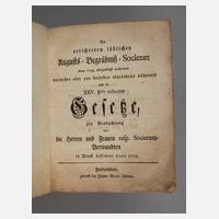Anno 1754, allerdings confirmirte nunmehro aber von derselben abgeänderte erläuterte und in XXV. §phis reducirte Gesetze zur Beobachtung vor die Herren und Frauen resp. Societaets- Verwandten in Druck befördert Anno 1772, Friedrichstadt bei Johann Martin Lehmann, Format 8°, 14 Blatt, Pappeinband, altersgemäßer Zustand.