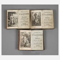 für die Jahre 1791–1793, von Friedrich Schiller, in Leipzig bey Göschen erschienen, Format 12°, enthält Schillers "Geschichte des dreyßigjährigen Krieges", 1. Teil: 12, 2. Teil: 17 und 3. Teil: 12 Kupferstiche vorhanden, originale Halbledereinbände, Grünschnitt, Rücken von Teil 1 restaurierungsbedürftig, angestaubt, Altersflecken, wenige Seiten eingerissen, befriedigende Erhaltungen.