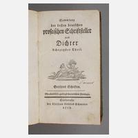 Sammlung der besten deutschen prosaischen Schriftsteller und Dichter, achtzigster Theil, Goethens Schriften, 2. Bd., Carlsruhe bei Christian Gottlieb Schmieder 1778, Format Kl. 8°, 344 S., grüner Pappeinband mit Rückenschildchen, Rotschnitt, Buchdeckel mit Flecken, Buchblock altersgemäß gut erhalten.