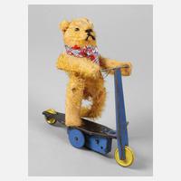 Fehn, Wolf & Co. Nürnberg, 1950er Jahre, ungemarkt, Blech farbig gefasst und Plüsch holzwollegestopft, Uhrwerksantrieb intakt, als kleiner Teddy mit Schuhknopfaugen, Nasenbestickung und beweglich gelagerten Gliedern, welcher scheinbar einen Tretroller mit verstellbarer Lenkung anschiebt, dazu Schlüssel, bespielter Zustand mit partiellen Lackabplatzern, Florverlusten und einer etwas offenen Naht, H ca. 16 cm.
