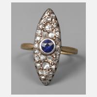 um 1880, Gelbgold gestempelt 585 und Silber, ca. 22 mm hoher navettenförmiger Ringkopf besetzt mit einem Saphir und zahlreichen Diamantrosen, geringe Tragespuren, RW 16 mm, G ca. 2,6 g.