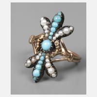 Mitte 19. Jh., Gelbgold geprüft 585/1000, ca. 25 mm hoher Ringkopf besetzt mit Türkisen und Perlen, geringe Tragespuren, RW 18 mm, G ca. 3,3 g.