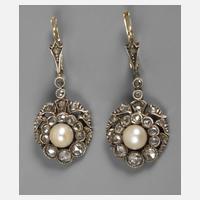 um 2000, Weißgold geprüft 750/1000, besetzt mit je neun weißen Saphiren und einer tropfenförmigen Perle, L ca. 42 mm, G ca. 5,4 g.