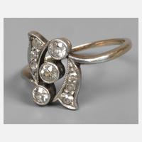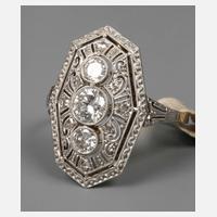 um 1920, Weiß- und Gelbgold gestempelt 585, ca. 22 mm hoher, durchbrochen gearbeiteter Ringkopf besetzt mit drei Brillanten von zusammen ca 0,7 ct und acht Diamantrosen, neuwertiger Zustand, aus Juweliernachlass, RW 18,5 mm, G ca. 3,3 g.