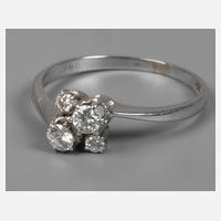 Ende 20. Jh., Weißgold gestempelt 585, leicht geschwungene Ringschiene, besetzt mit vier Brillanten von zusammen 0,4 ct, RW 20 mm, G ca. 2,7 g.