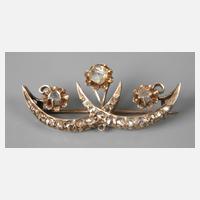 um 1870, Silber und Gelbgold geprüft 585/1000, besetzt mit insgesamt 36 Diamantrosen und zwei Perlen, L ca. 32 mm, G gesamt ca. 5,5 g.