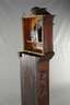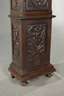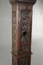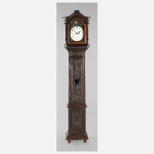 auf Tür innen datiert 1740, zweiteiliger, reich geschnitzter Korpus mit abgeschrägten Ecken, aus massiver Eiche, dunkelbraun gebeizt, Front und Seiten verziert mit Floraldekor, Delfinen, Maskaronen und Wappen, Kopfteil mit feinen Bronzebeschlägen, Darstellung von Amoretten, mittig Scheinpendel mit Posaune blasendem Engel, makelloses gewölbtes Emailziffernblatt, Halbstundenschlag auf zwei Glocken, Kopf mit Unterteil nicht original zusammengehörig, Bekrönung fehlt, stärkere Altersspuren, funktionstüchtig, Maße Unterteil H 169 x B 44 x T 30 cm, Maße Kopf H 57 x B 48 x T 22 cm.