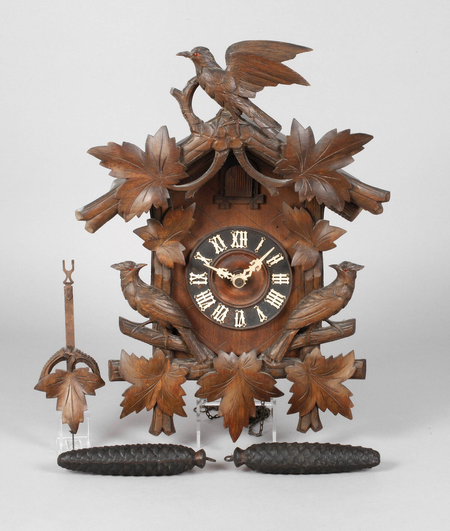 Schwarzwald, um 1900, Gehäuse aus Buche und Linde dunkelbraun gebeizt, Zeiger und römische Ziffern aus Bein, Halbstundenschlag auf Tonfeder, Kuckuck mit zwei Blasebälgen, funktionstüchtig, Bekrönung alt repariert, H 50 cm.