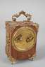 Deutsch, um 1890, bezeichnet Lenzkirch AGU, gesetzlich geschützt, massives Nussbaumgehäuse mit feinen vergoldeten Messingbeschlägen im Rokokostil, emailliertes Ziffernblatt mit arabischen Zahlen, Werk läuft, guter Zustand, H 17 cm.