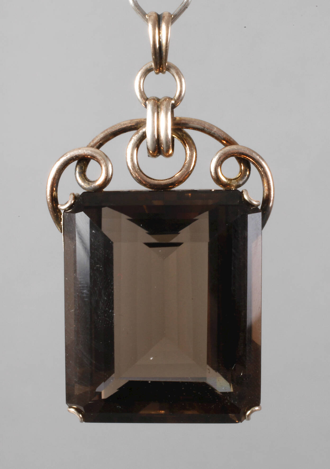 um 1930, Silber vergoldet und gestempelt 835, besetzt mit einem rechteckigen, facettierten Rauchquarz von ca. 37 x 31 mm, Tragespuren, Maße ca. 65 x 36 mm, G ca. 38,7 g.