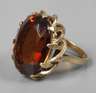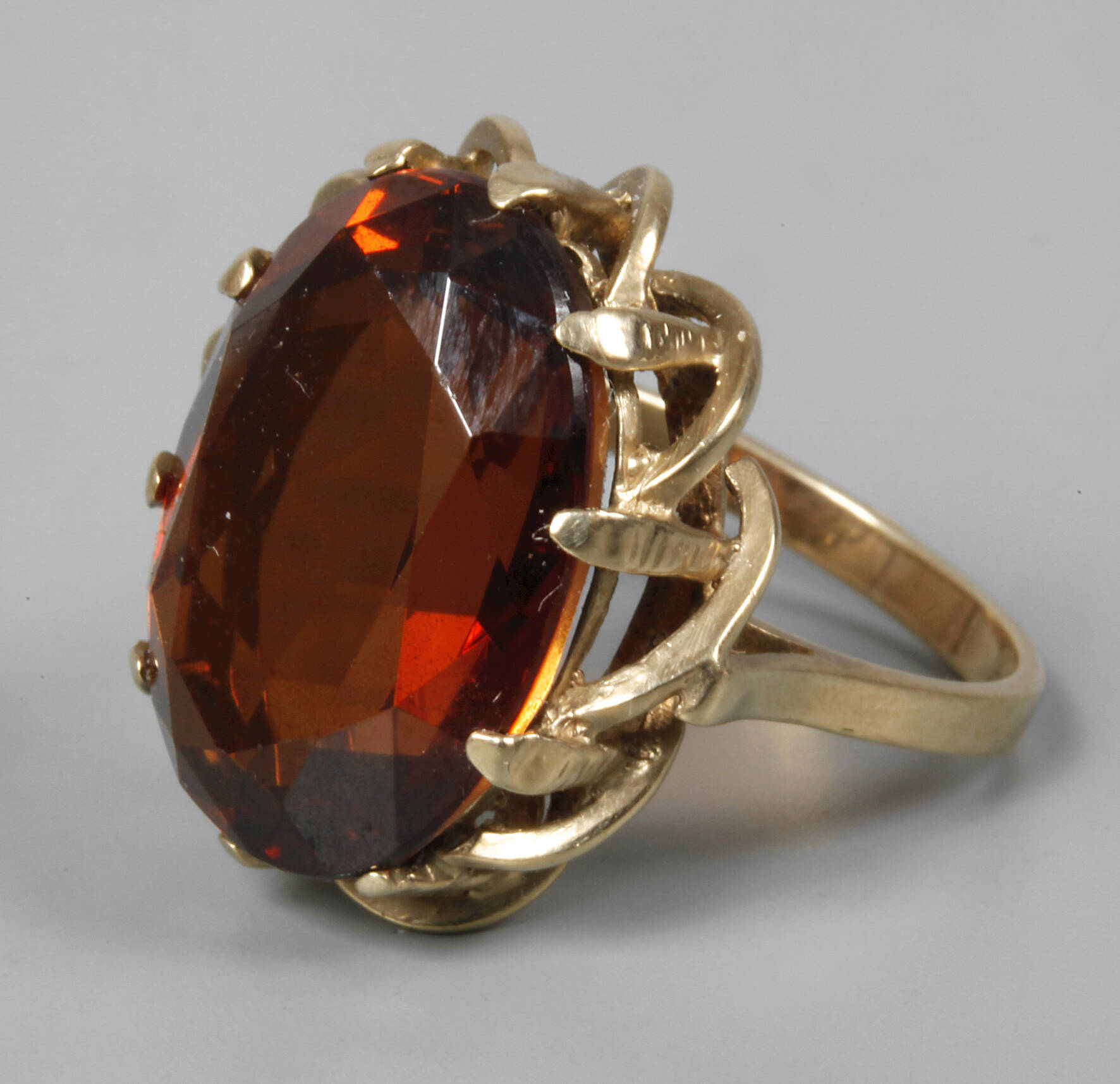 um 1970, Gelbgold gestempelt 333, ca. 21 mm hoher Ringkopf besetzt mit dunklem, oval facettiertem Citrin, leichte Tragespuren, RW 19 mm, G ca. 7,7 g.