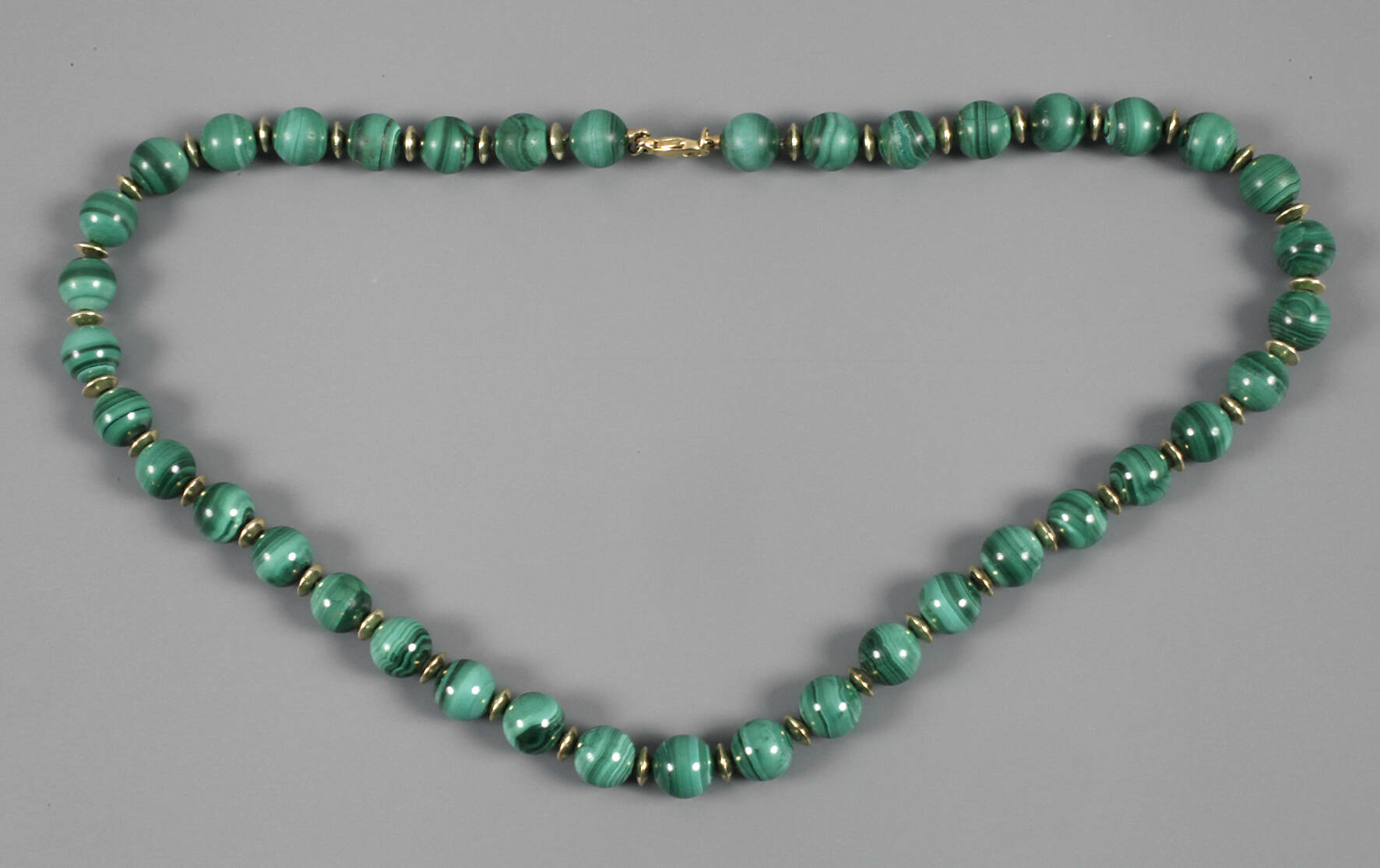 um 2000, Zwischenteile und Karabinerverschluss Gelbgold geprüft 585/1000, Malachitkugeln von D 10 mm, L ca. 51 cm, G ca. 92 g.