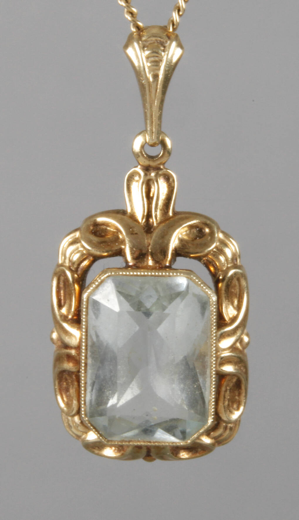 um 1930, Gelbgold gestempelt 585, besetzt mit einem Aquamarin im Scherenschliff von ca. 13 x 10 mm in Zargenfassung, an ca. 44 cm langer Kette gestempelt 585, leichte Tragespuren, G ges. ca. 5,3 g.