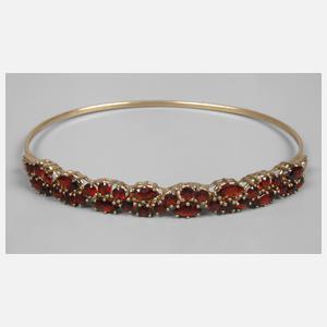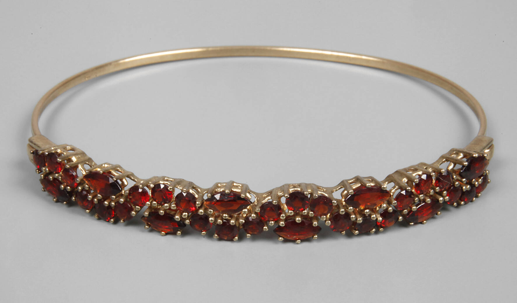 Ende 20. Jh.,Gelbgold gestempelt 333, besetzt mit 33 facettierten Granaten, D max 62 mm, G ca. 7,2 g.