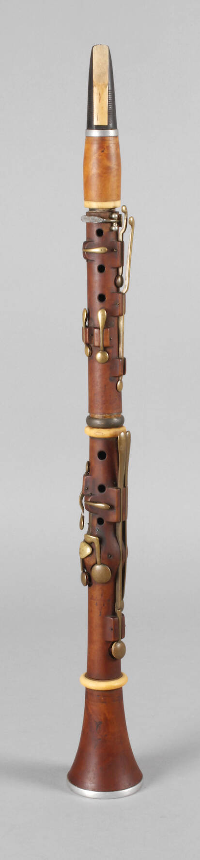 19. Jh., unleserlich gemarkt, dunkles Edelholzgehäuse, mit Messingmontierungen und Zierelementen aus Bein bzw. aus Nickel, fragmentarische Erhaltung, nicht passendes Mundstück beigegeben.