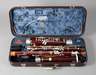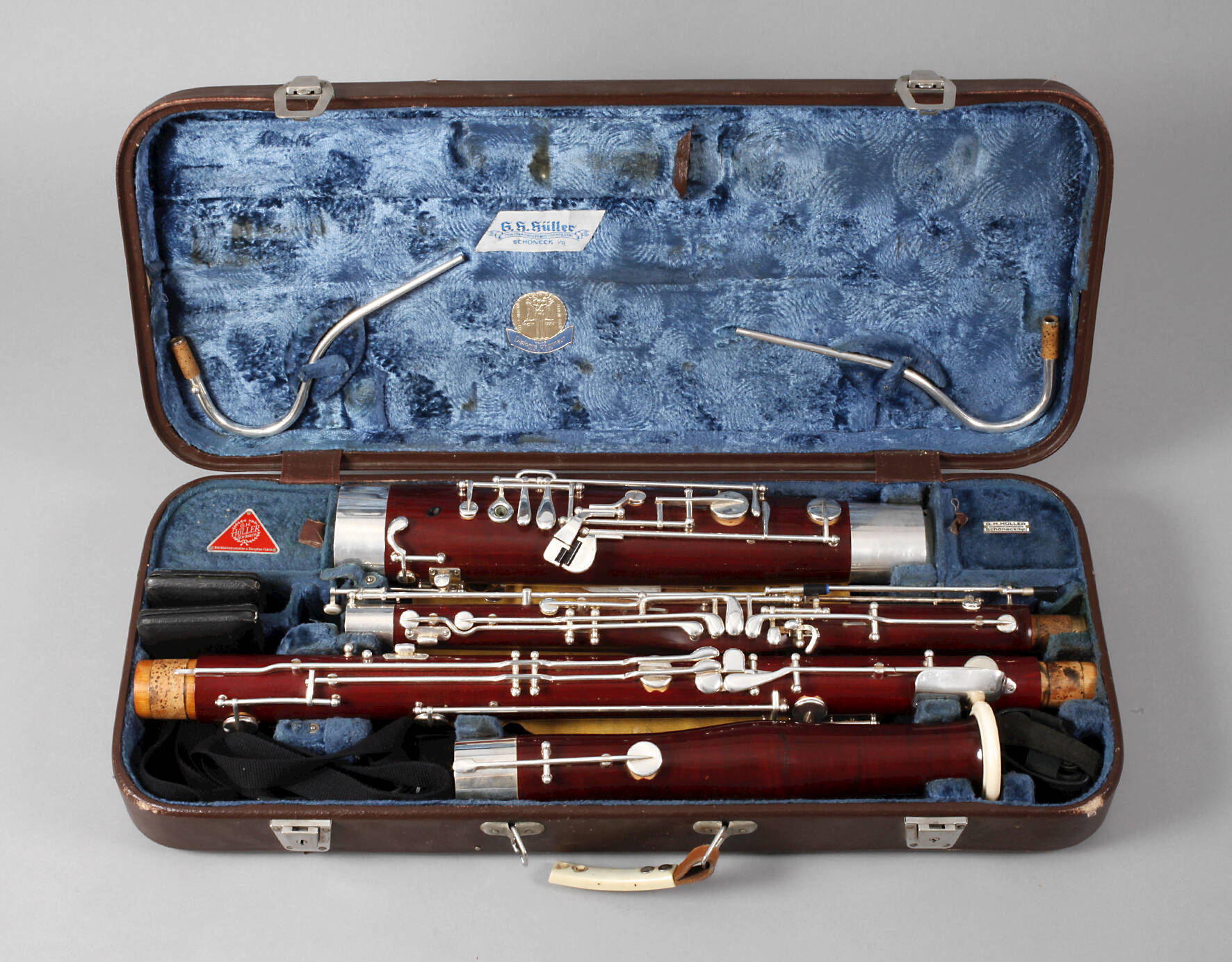 Mitte 20. Jh., brandgemarkt Arnolds & Sons, vierfach steckbares Gehäuse aus rötlich gebeiztem Tropenholz, versilberte Metallmontierungen, sehr guter, spielbereiter Zustand, im Etui, dieses gemarkt G. H. Hüller Schöneck, L ges. ca. 180 cm.