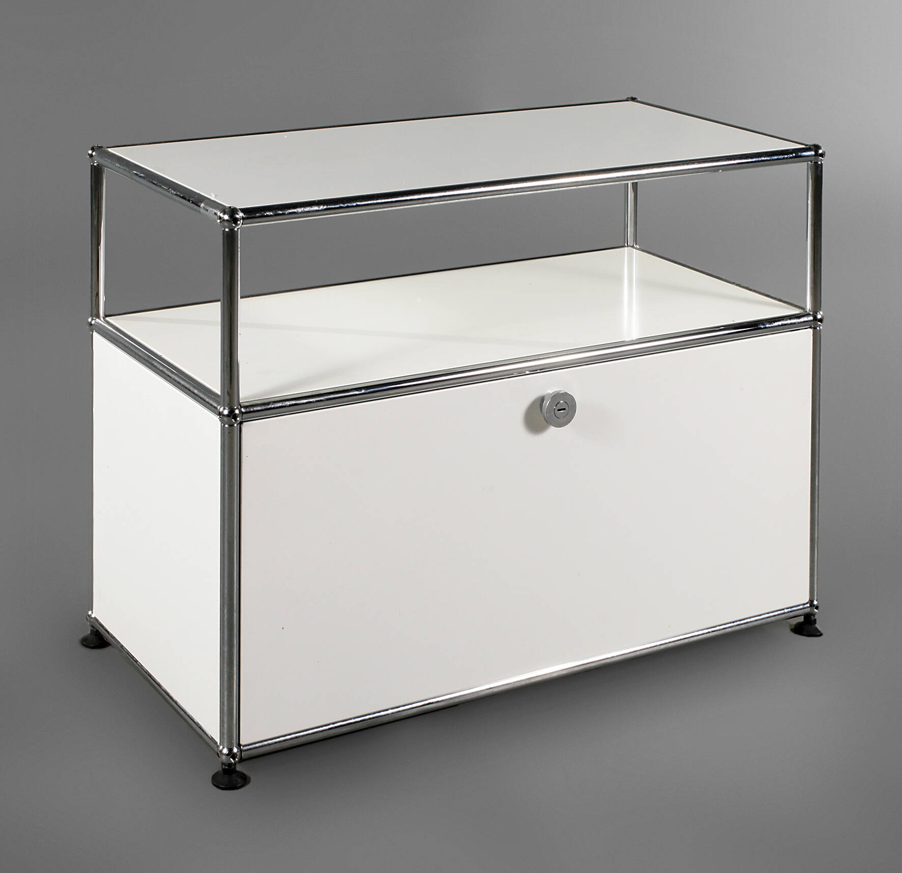 1990er Jahre, Stahlrohr verchromt und Stahlblech weiß lackiert, modulares Baukastensystem, Unterteil mit klappbarer Tür, guter Zustand, Maße 59 x 78 x 37 cm.