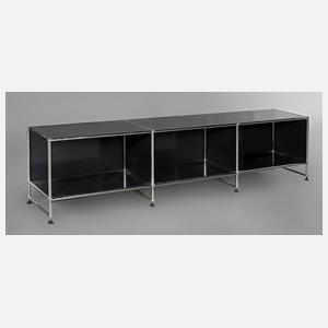 1980er Jahre, Stahlrohr verchromt und schwarz lackiertes Stahlblech, Baukastensystem, geringe Gebrauchsspuren, Maße 50 x 225 x 37 cm.