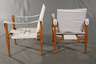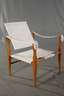 nach einem Entwurf von Kaare Klint 1933, Ausführung wohl 1960er Jahre in Buche massiv, weißer Leinenbezug, zerlegbare Armlehnsessel mit drehbarer Lehne, Bezug der Lehnen teilweise angerissen, sonst guter Zustand, Maße 77 x 60 x 60 cm. Literatur: Vgl. Gorm Harkær, Kaare Klint, Kopenhagen, 2010, Bd. 2, S. 33 ff.