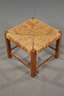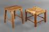 quadratischer Hocker aus massiver Eiche mit originalem Binsengeflecht, der andere aus massiver Buche mit unter Dampf gebogenen Beinen, verschraubte Sitzfläche mit Eingriff, Trocknungsriss, restaurierungsbedürftig, H 48 und 38 cm.