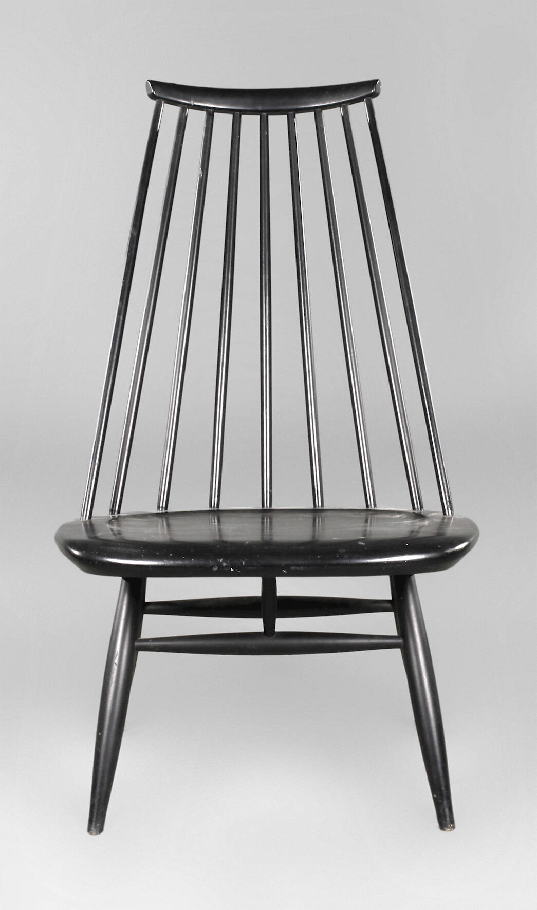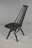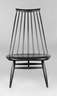Entwurf Ilmari Tapiovaara für Asco, 1960er Jahre, gemarkt "ASCO Export", Massivholz mattschwarz lackiert, niedrige gemuldete Sitzfläche, geneigte Lehne, bestehend aus neun gedrechselten Rundstäben, H 91 cm, SH 40 cm.