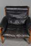 Entwurf 1960er Jahre für Ire-Möbler Schweden, Gestell aus massivem Teakholz, lose aufgelegte Sitzkissen aus schwarzem Rindsleder mit Nackenrolle, mit Alters- und Gebrauchsspuren, Maße 84 x 90 x 95 cm.