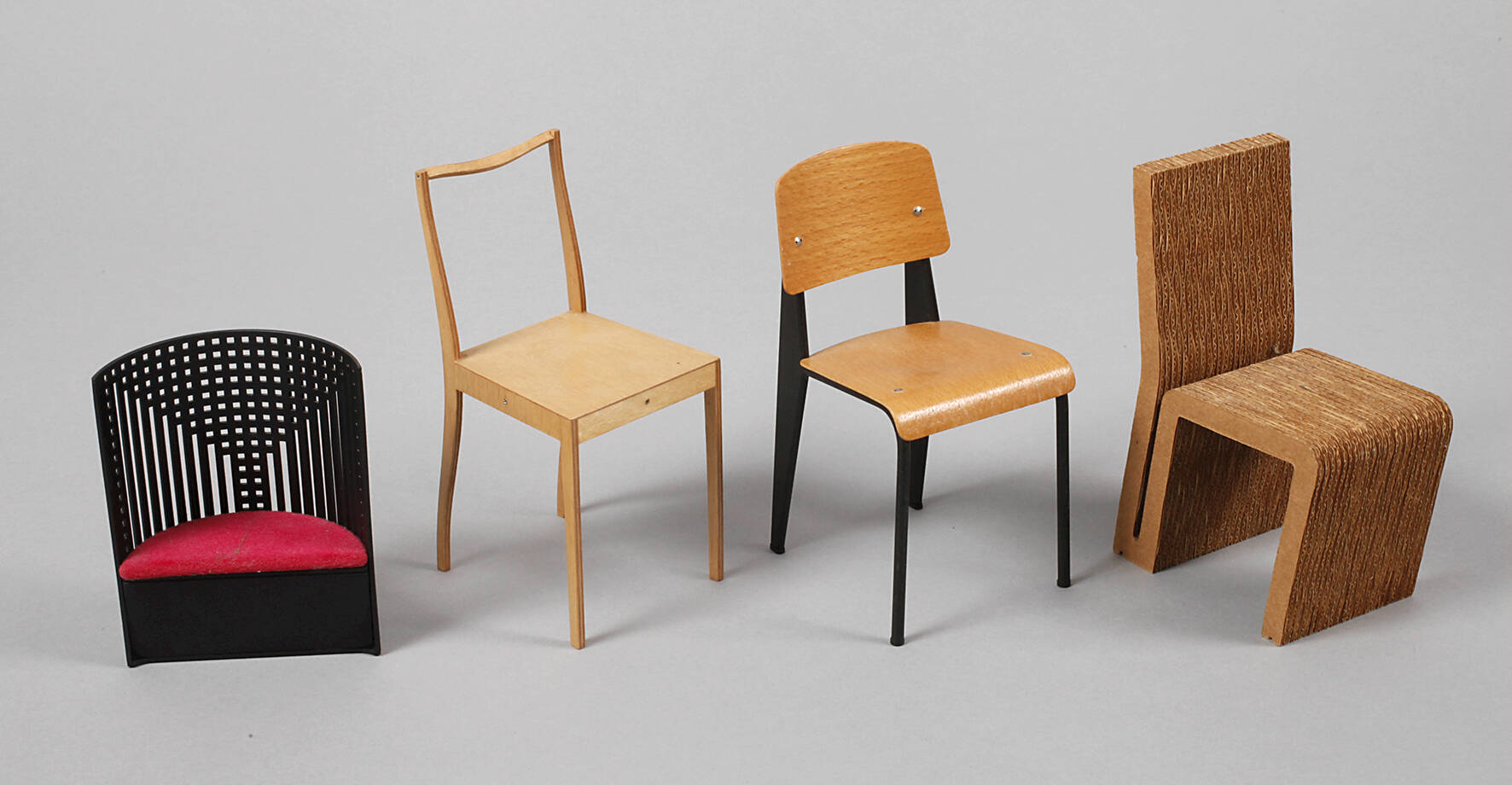 nzl., dreimal Ausführung Vitra Design Museum, unterschiedliche Materialien, Standard Chair von Jean Prouvé um 1930, Easy Edge Side Chair von Frank O. Gehry um 1979, Ply-Chair von Jasper Morrison von 1989, dazu Charles Rennie Mackintoshs Chair für die Willow Tea Rooms von 1904, vorwiegend im Maßstab 1:6, H max. 15 cm.