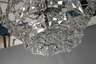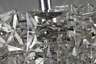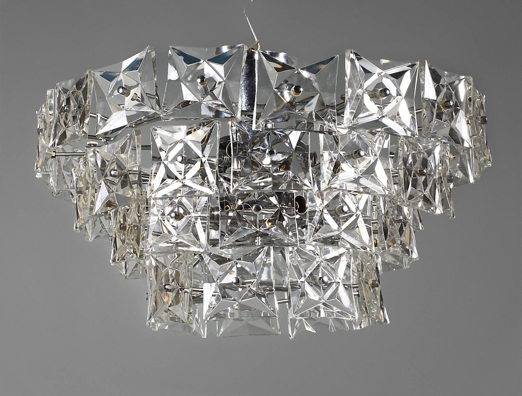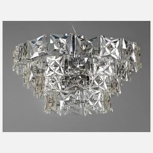 um 1980, verchromtes Metallgestell, auf vier Ebenen abgehängte, verschieden große Ringe, umlaufend verziert von beschliffenen Klarglasquadraten, zwei Befestigungsschrauben fehlen, sonst sehr guter Zustand, H 40 cm, D ca. 60 cm.
