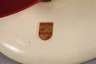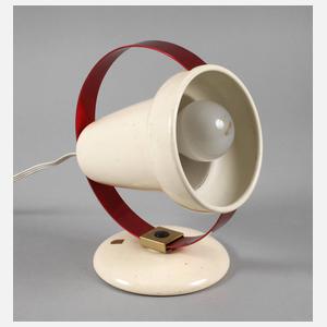 1950er Jahre, Entwurf Charlotte Perriand, Hersteller Philips, gemarkt, Weißblech cremefarben bzw. rot gefasst, Rundfuß mit beweglich gelagertem Ring und neigbarem Glockenschirm, einflammig elektrifiziert, Altersspuren, H 25 cm.