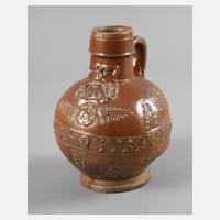 um 1600 bis 1650, graues Steinzeug handabgedreht, braun glasiert, aufgemodelte Motive, florale Bänder, Palmetten und Gesichter im Profil, kurzer gemuldeter Bandhenkel, geringe Glasurabplatzer, insgesamt guter altersgemäßer Zustand, H 18 cm.