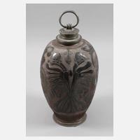 Bad Muskau, um 1700, braunes Steinzeug handabgedreht, fein geritzt und in Brauntönen glasiert, beidseitig ein Doppelkopfadler mit Reichsapfel, auf oktogonal facettierter Wandung, dazwischen floraler Rankendekor mit Weintrauben, originaler Zinnstandring sowie Zinngewindehals, Schraubdeckel mit klappbarer Öse, altersgemäße Besterhaltung, H total 42 cm.