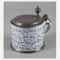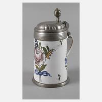 um 1780, gepinselter Buchstabe P sowie geritzte Modellnr. 61, in der Glasur geritztes X, rötlicher Scherben weiß glasiert, bemalt in Scharffeuerfarben, Rosenblüte mit Schleife und seitliche Blümchen, Montierung bestehend aus Zinnstandring, Lippenrand und godroniertem Deckel mit Kugelrast, graviertes Besitzermonogramm DK, innen eine Fehlstelle und Glasurabplatzer an der Wandung und am Griff, insgesamt guter altersgemäßer Zustand, H 19 cm.
