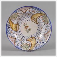wohl Oberitalien, 18/19. Jh., gemarkt M, in Scharffeuerfarben bemalt, stilisierte Callablüten, getupfter Dekor, geometrische Motive, mittig ein kleines Blütenbukett, die Unterseite herstellungsbedingt brandfleckig, insgesamt guter altersgemäßer Zustand, D 35 cm.