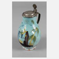 1. Hälfte 18. Jh., geritzte Nummer 9., rötlicher Scherben mit türkisfarbener Glasur auf schräg gerippter Wandung, mit Scharffeuerfarben bemalt, schauseitig ein Architekturmotiv, seitlich Palmen und Gräser, innen vergoldeter Zinndeckel mit Muscheldrücker und graviertem Besitzermonogramm "HP", mit Zinn reparierter Griff (ersetzt), an Stand und Mündung kleine Fehlstellen sowie ein kurzer Haarriss, H 20 cm.